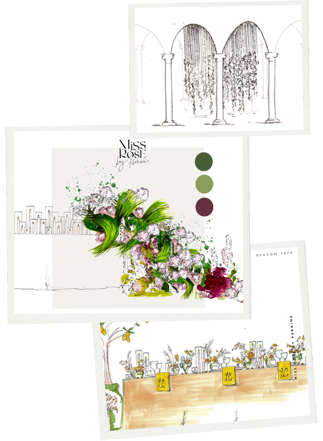 Chaque création prend forme à travers une direction artistique précise : recherche d’univers, palette, croquis à la main, sélection florale et mise en scène finale.